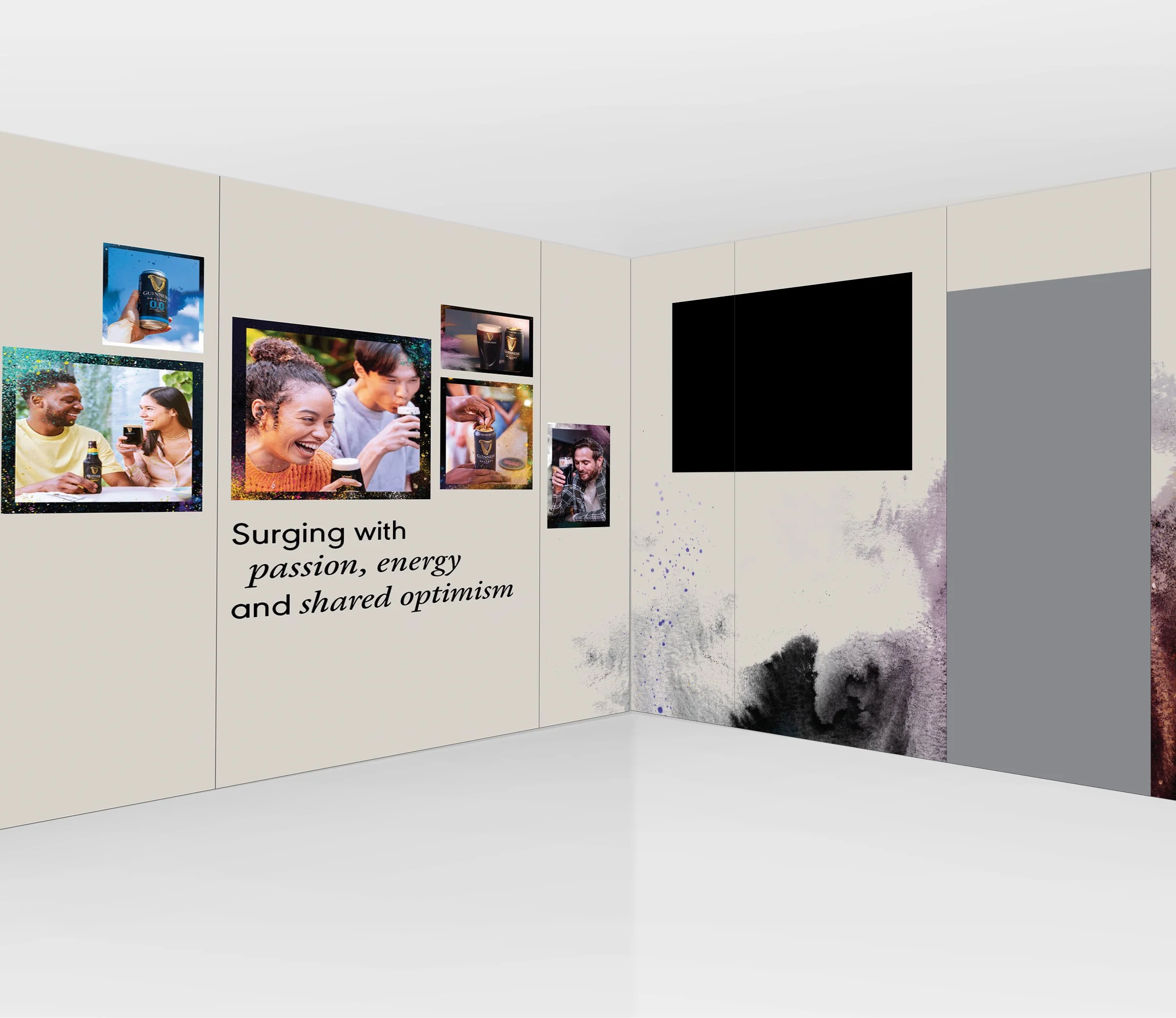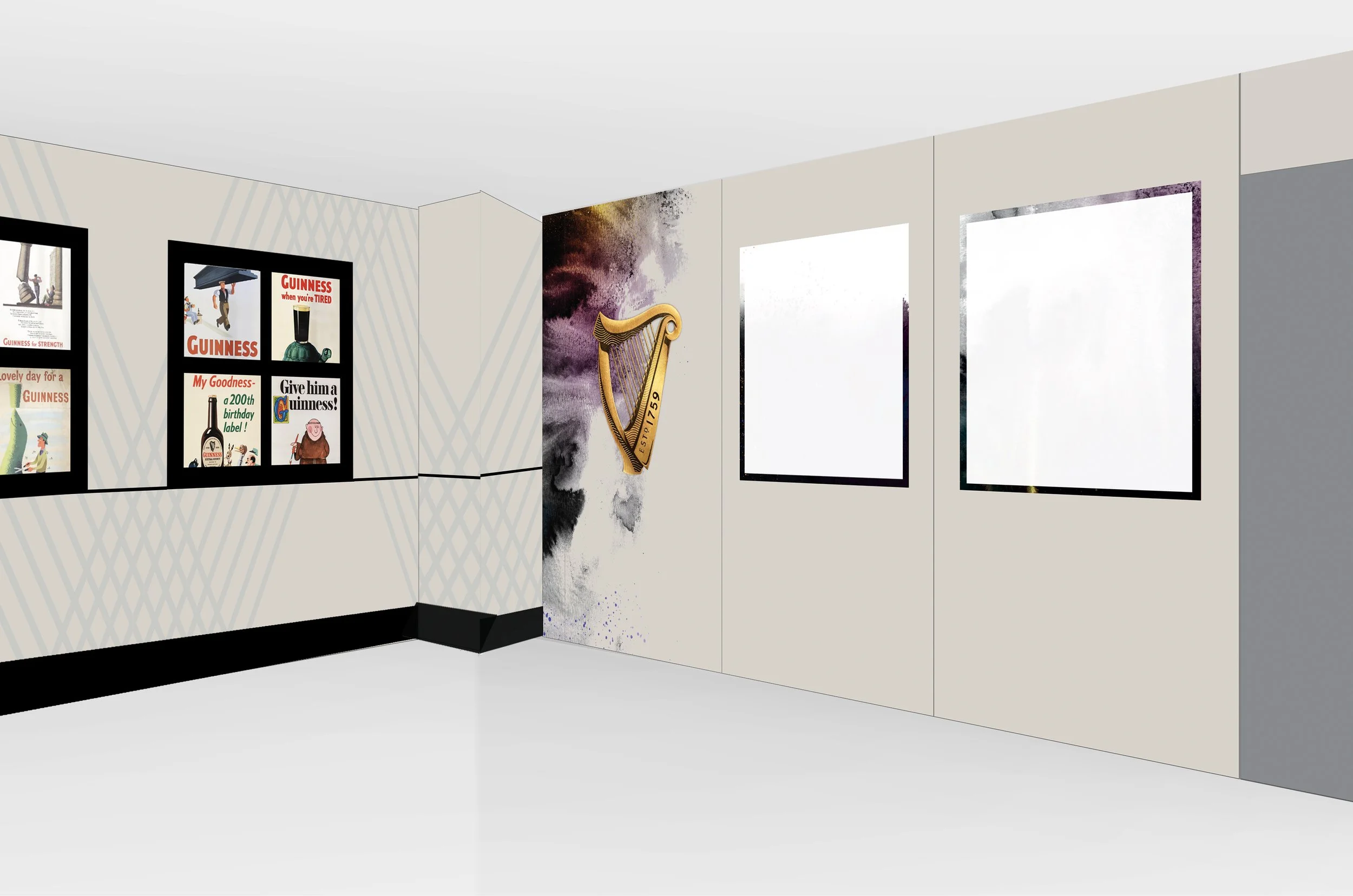 Brought Guinness to life in Runcorn with textures from the Guinness Brand Guidelines to bring some energy to the walls. A bespoke wallpaper inspired by the Guinness Harp runs along two walls, and the plain grey helps to contrast the vivid colours of the textures. Images reinforce Diageo messaging by showing Guinness being enjoyed. Heritage Guinness images were used on these panels, making the windows almost look like frames (Contravision was used for the windows, meaning you can see out but people cannot see in).