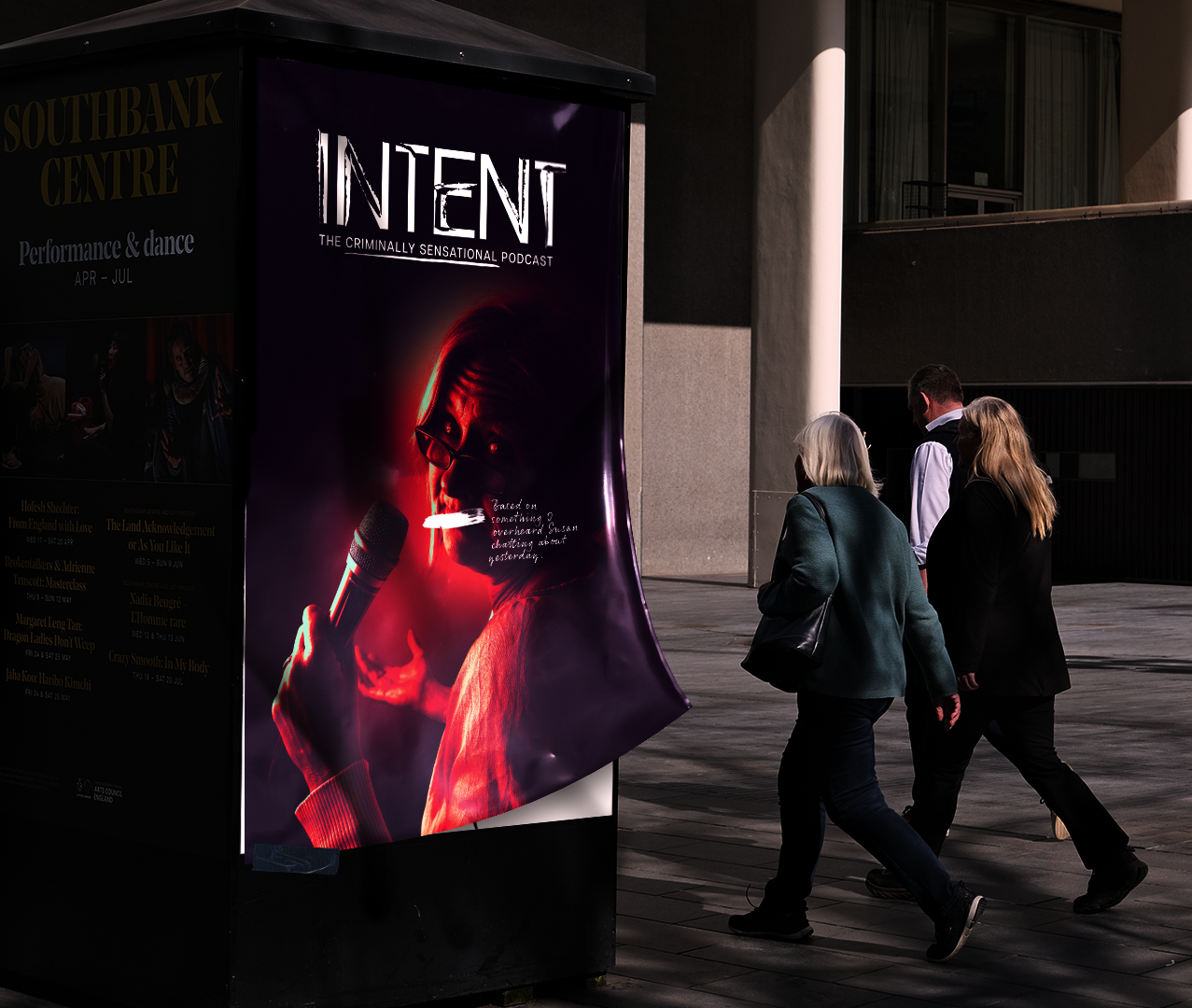Promoting a true crime podcast that feels a little ‘off’, the ‘Intent’ poster campaign invites the audience to uncover the truth behind the medium. Consequently encouraging them to sign a petition to the UK government for the introduction of true crime podcast regulations.
