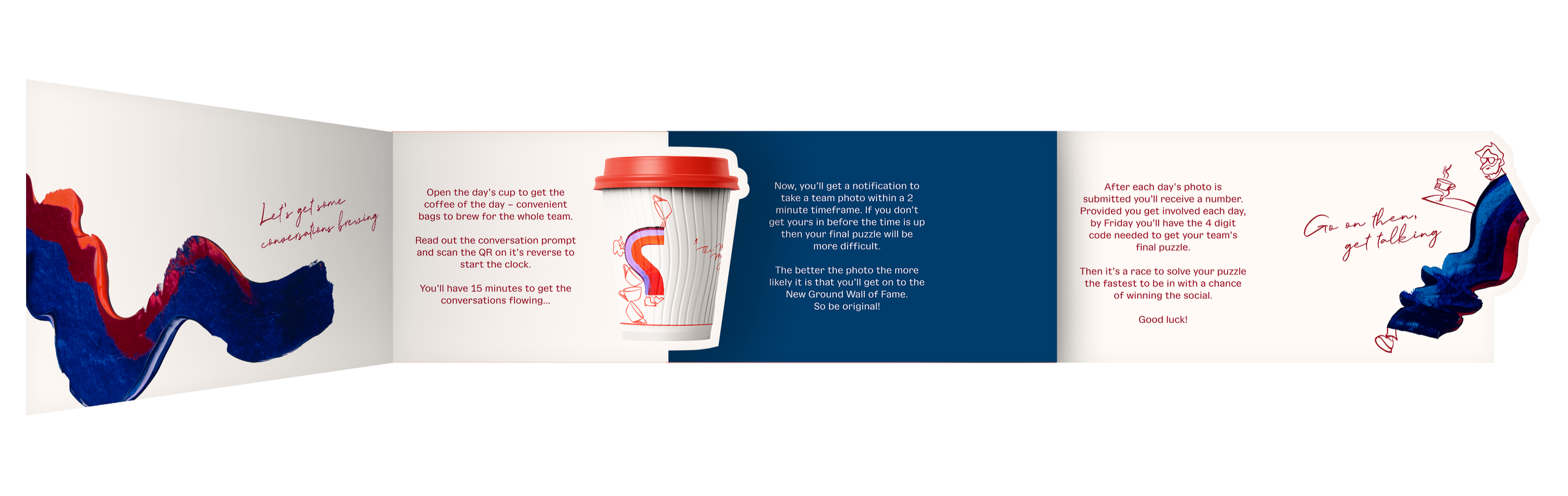 In a week long event throughout offices in Bank, co-workers are challenged to find their commonalities in daily conversations over coffee. A series of seemingly inane conversation prompts, such as ‘what’s the best pasta shape’, aim to create an opinion that the disconnected generations can connect over. With this new sense of camaraderie, the co-workers unite as a team at the end of the week to solve a final puzzle. Racing against other offices, the fastest team wins a latte art social, hosted at Pret, to build on these new office relationships.