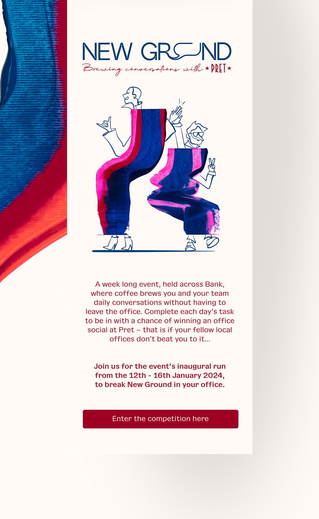 At Pret, as the café for the office worker, we see something that unites us all – the desperate need for a caffeine-fuelled morning commute. We believe coffee’s conversation-carrying power can unearth commonalities between even the most unlikely pairings. By harnessing office workers’ common ground, we aim to break New Ground within office culture.